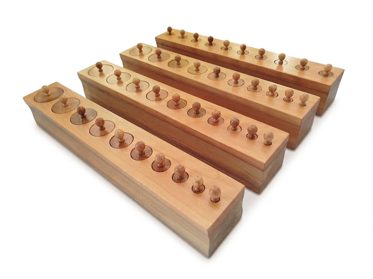 El set consta de 4 bloques de madera sólida, cada uno con 10 cilindros que varían de forma precisa en sus dimensiones.