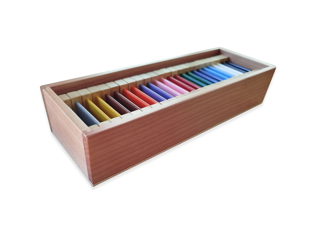 A diferencia de la caja de tablillas Nº 1, cuyo función principal es introducir al mundo del color a través de la identificación y emparejamiento de los 3 colores primarios (rojo, amarillo y azul), la caja de tablillas de colores Nº 2 amplía la selección a 12 colores, permitiendo trabajar la discriminación visual de colores primarios, secundarios y neutros.